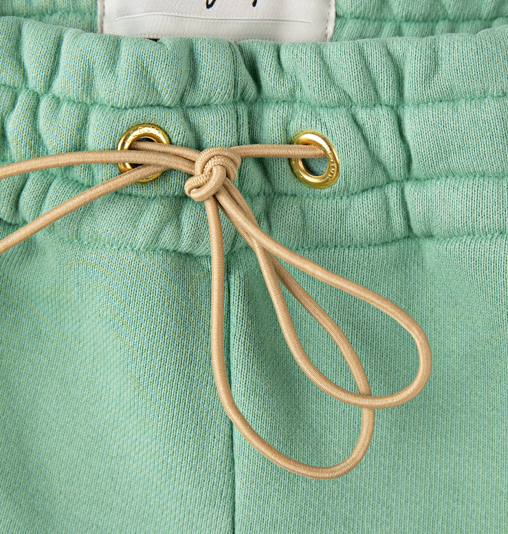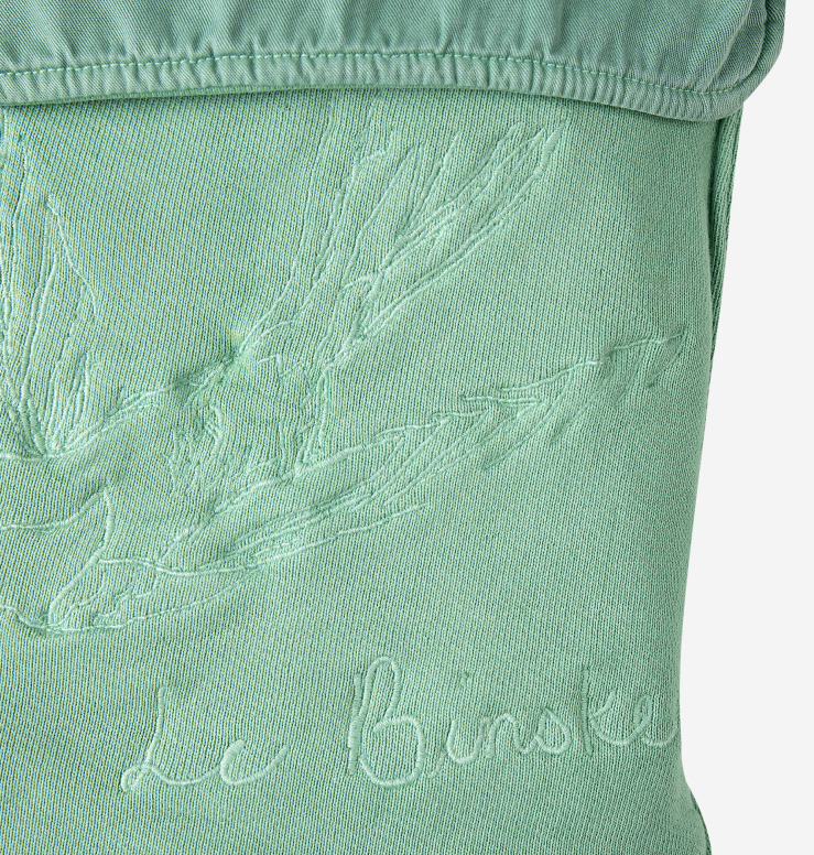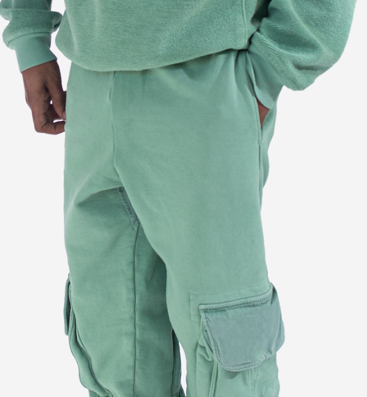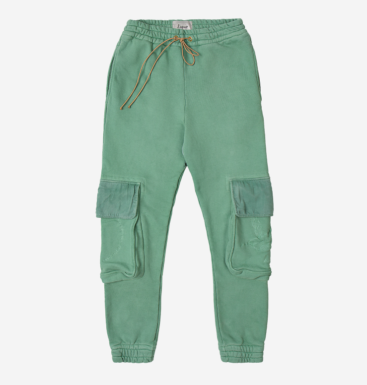 Teal cotton sweatpant with oversized cargo pockets on both legs | Embroidered hummingbird in flight and 'Le Binske' logo | Lavender elastic drawstring cord | Pairs with teal Mac Hoodie | 98% cotton 2% elastane