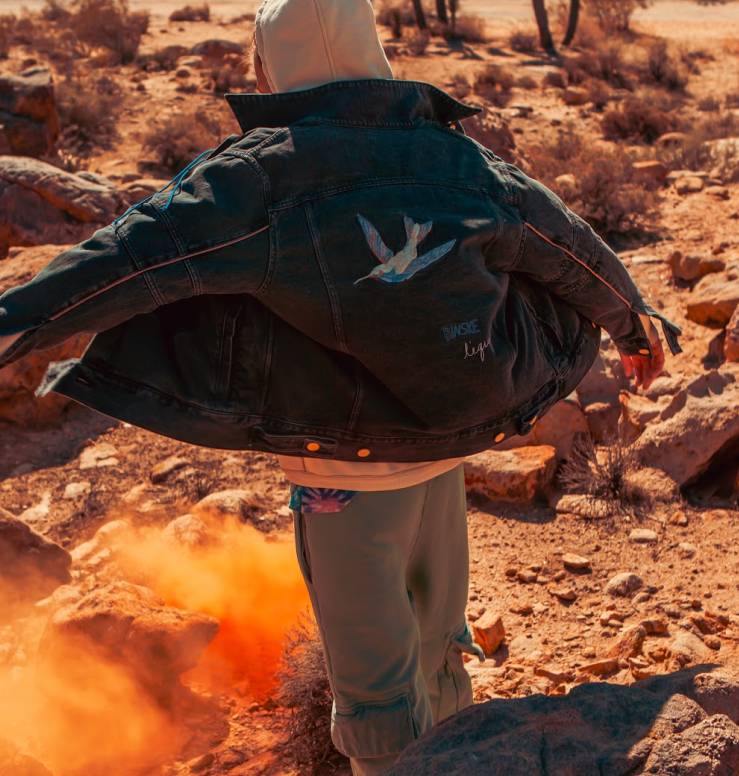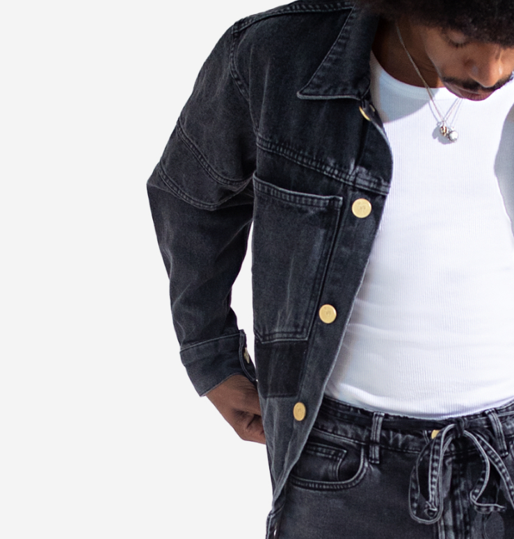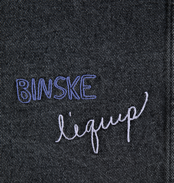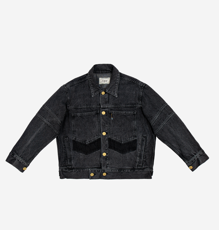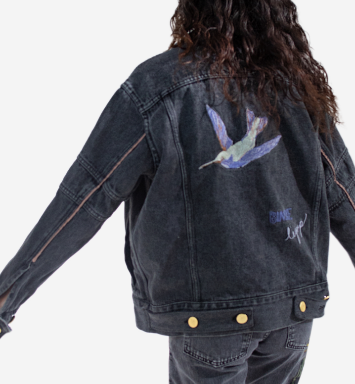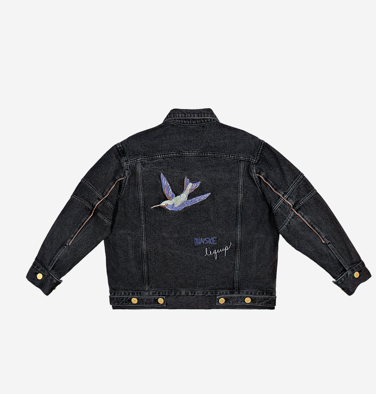 Unisex black denim Luke jacket | Embroidered blue hummingbird, and Binske and l’equip logos on back | Signature l'equip evil eye pin on front | Oversized chest pockets | Rosé colored piping on sleeves | Brass buttons | 100% cotton