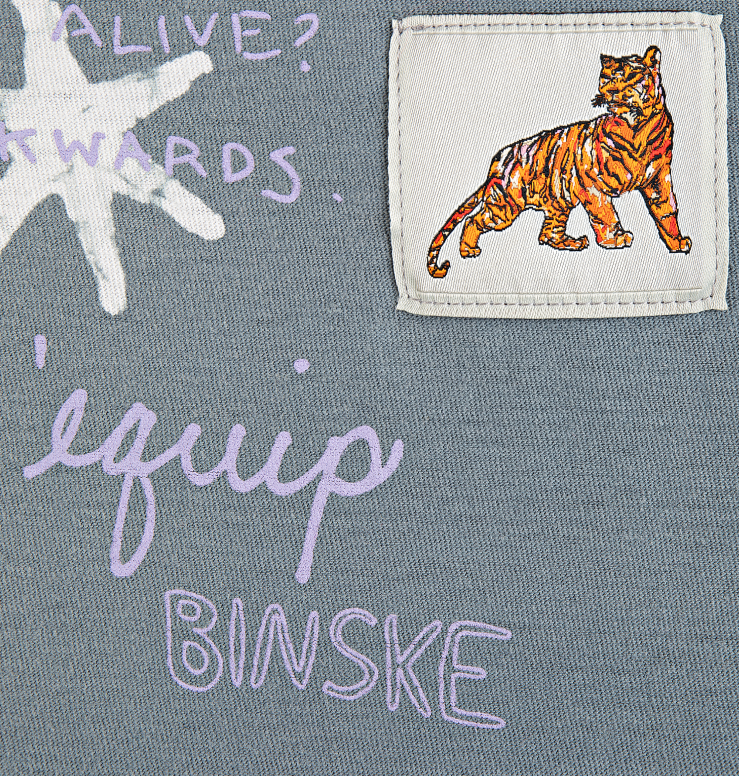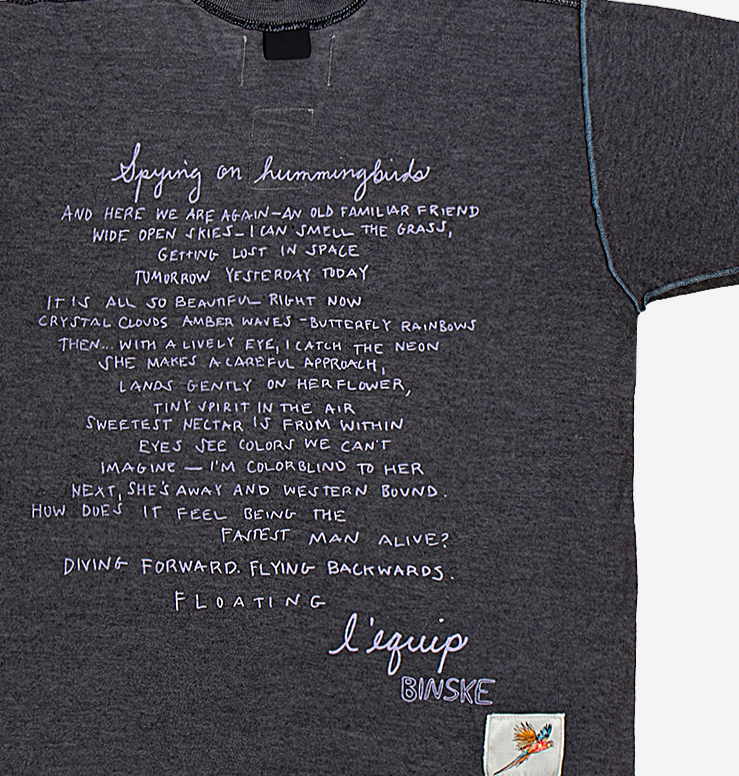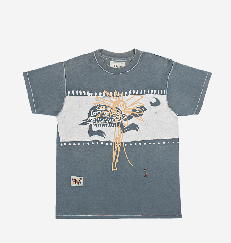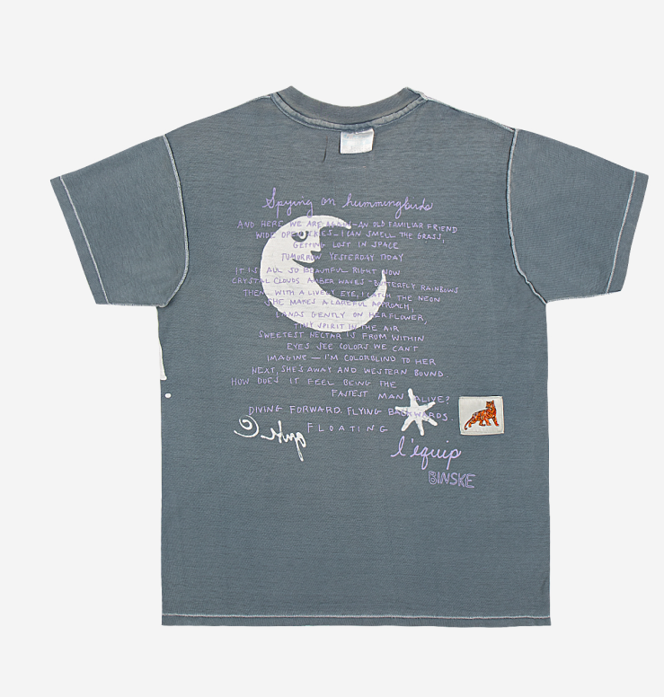One-of-a-kind dark heathered gray inside out vintage t-shirt | Hand drawn screen printed yellow flower | Signature blue l’equip evil eye pin | Two white decorative patches with seaweed and butterfly on front | ‘Spying on Hummingbirds’ ode on back | 98% cotton 2% elastane |