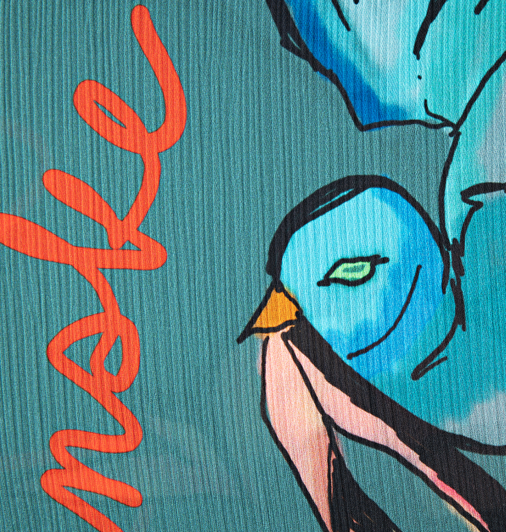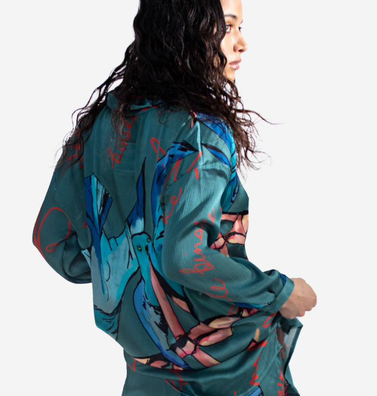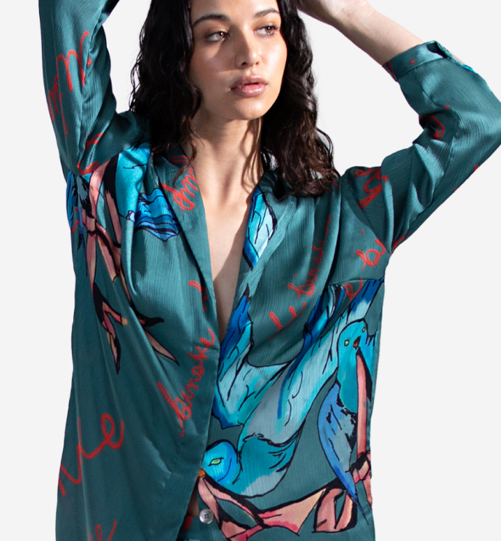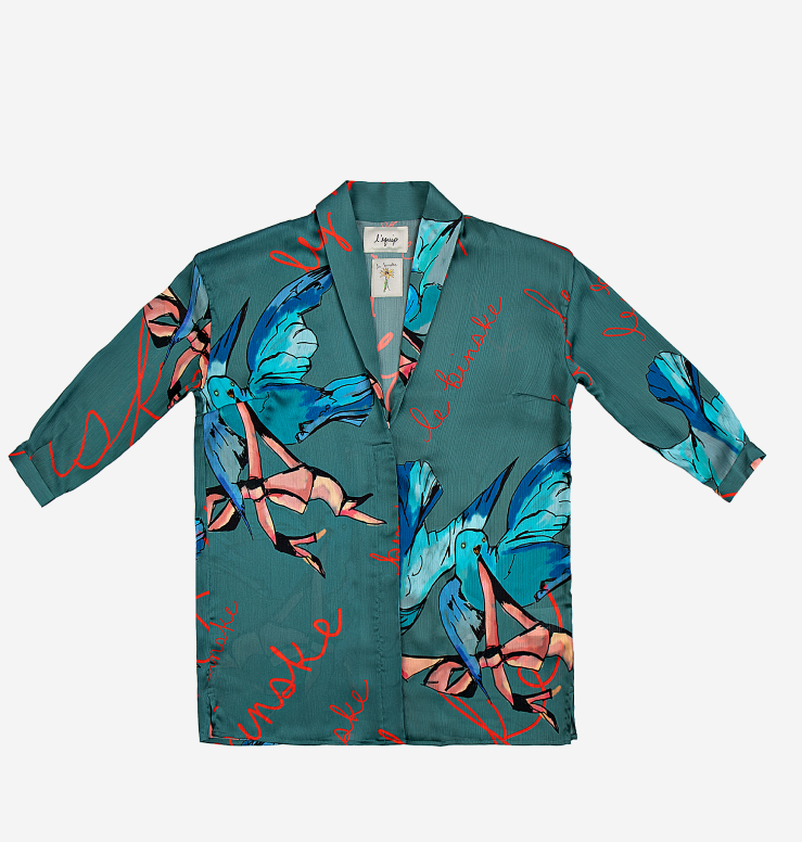 Blue bird and ‘le binske’ print lapel collar blouson | Light and flowy | Long sleeves | Hidden buttons at front | 100% rayon