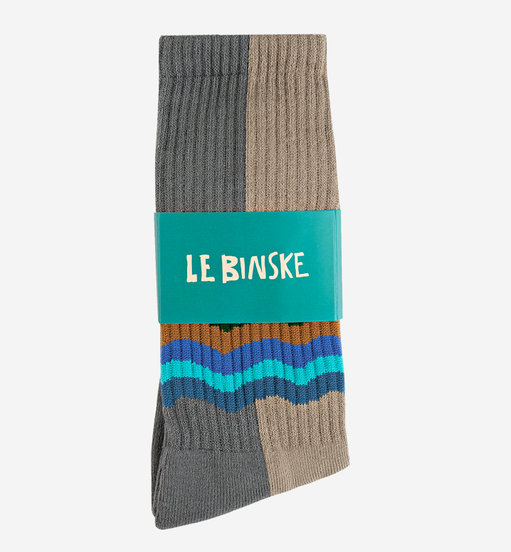 Unisex lime green and apricot colored socks | Wave pattern on ankle | 92% Cotton 8% Spandex. Unisex steel gray and mushroom colored socks | Wave pattern on ankle | Le Binske logo | 92% Cotton 8% Spandex