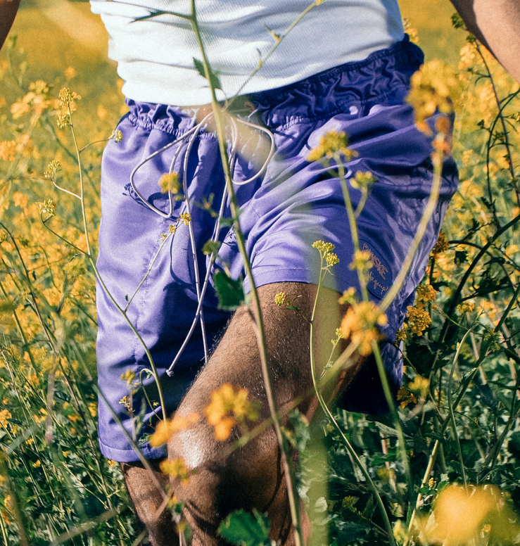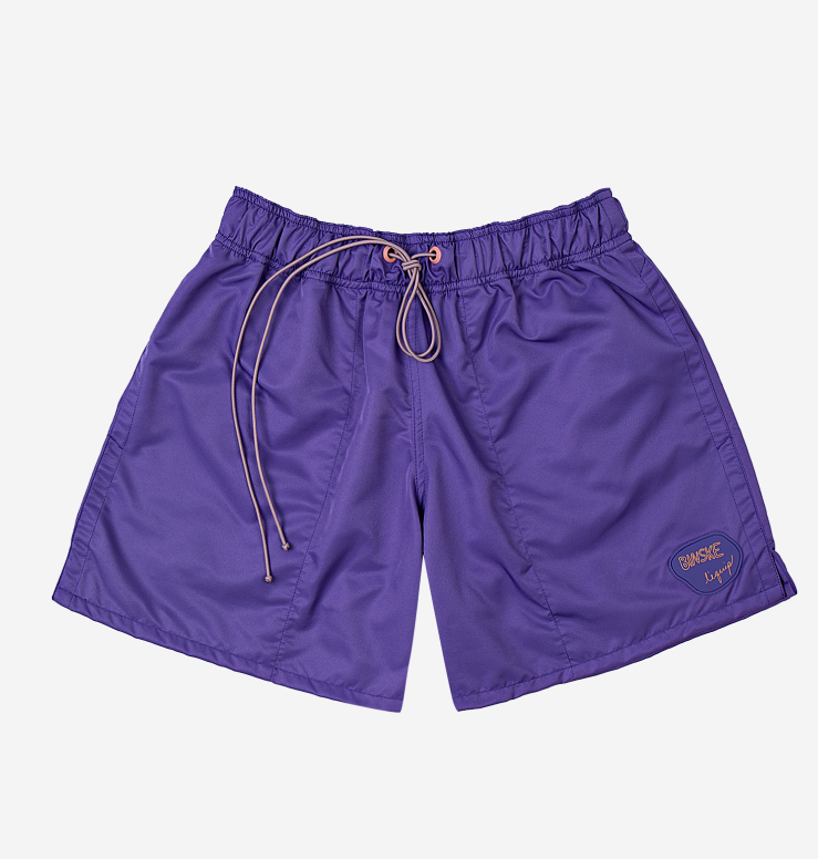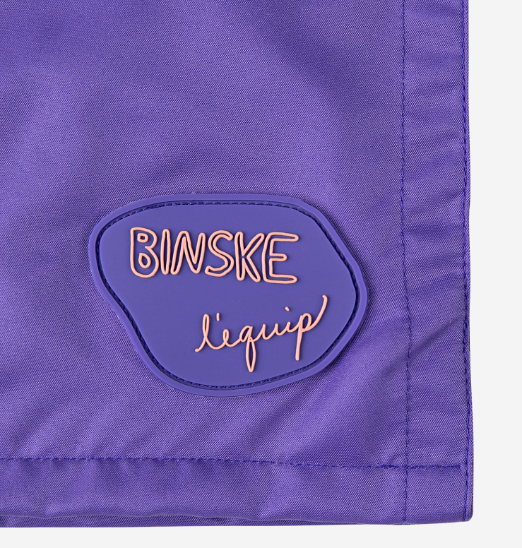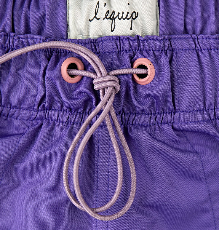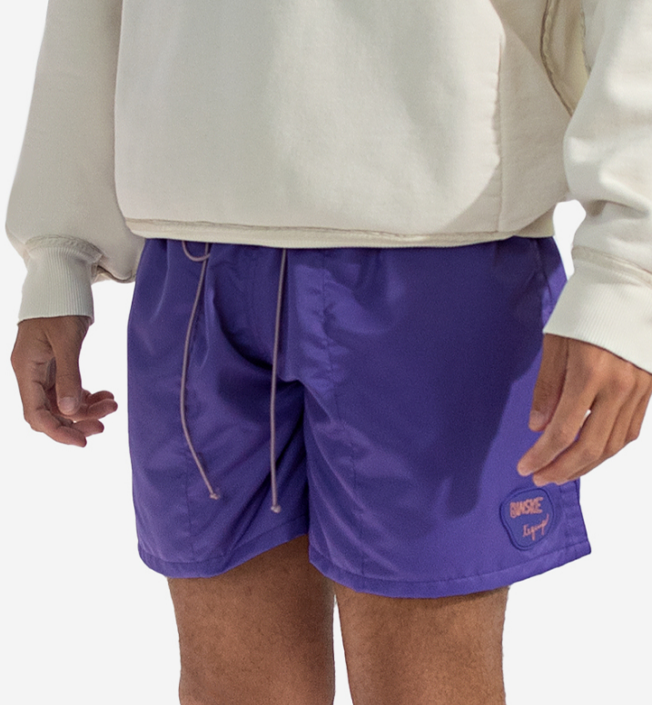 Violet polyester mid-length men's shorts with elastic waistband | Matching lavender elastic drawstring cord | Pink grommets | Decorative purple patch with Binske and l’equip logos on front left leg | Pink grommet on back pocket | Mesh lining | 100% polyester