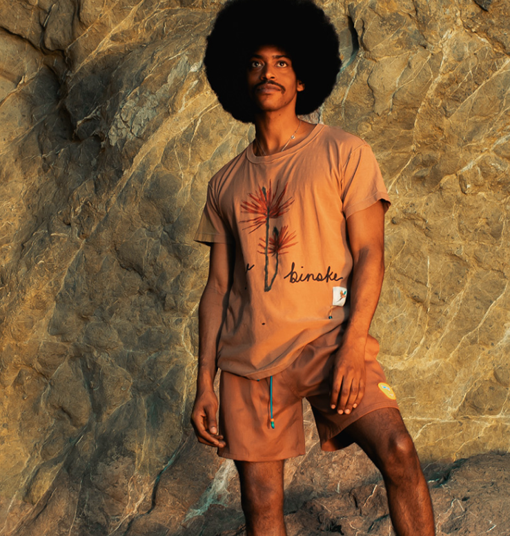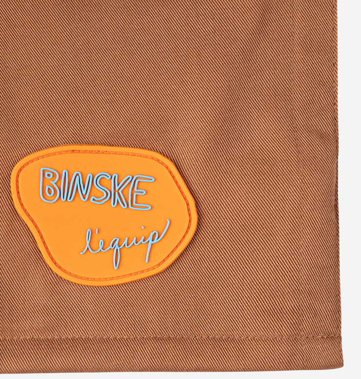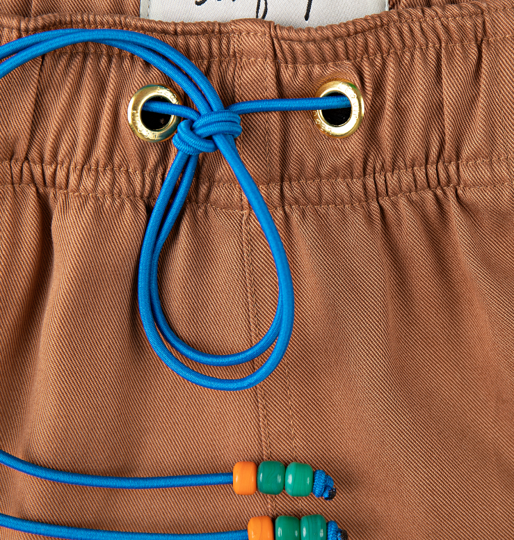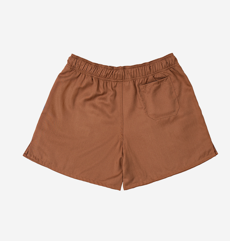 Russet tencel mid-length mens shorts with elastic waistband | Peacock blue elastic drawstring cord | Brass grommets | Green and orange wooden beads | Decorative orange patch with Binske and l’equip logos on front left leg | Mesh lining | Pairs with l’equip vintage tee and socks | 100% tencel