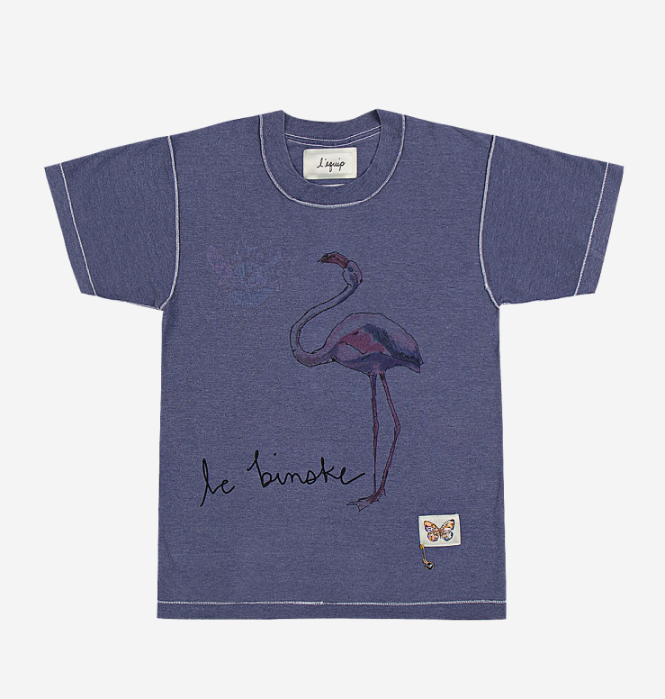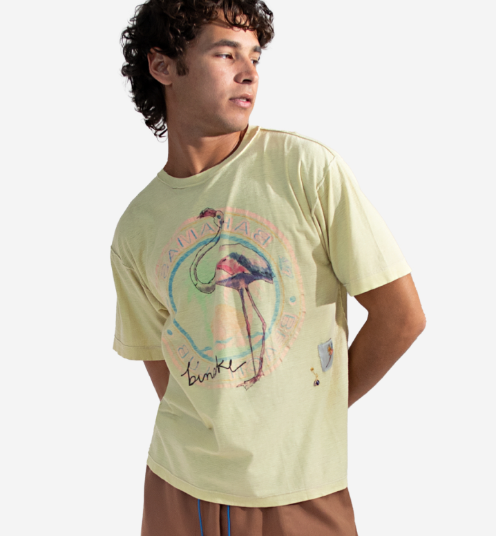 One-of-a-kind daffodil yellow inside-out vintage t-shirt | Hand drawn screen printed flamingo and le binske logo | Signature blue l’equip evil eye pin | White decorative patch with parrot print | ‘Spying on Hummingbirds’ ode on back | 98% cotton 2% elastane |