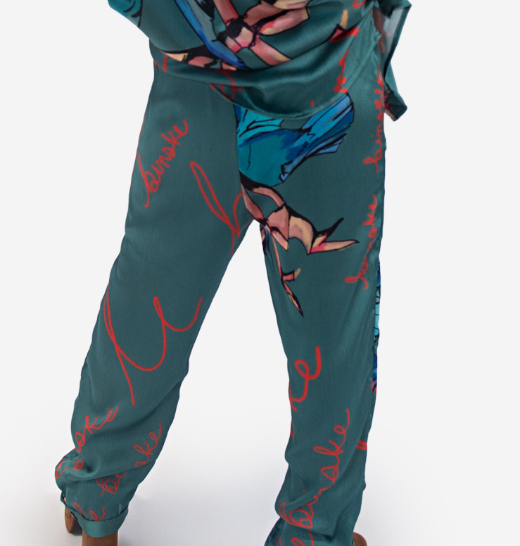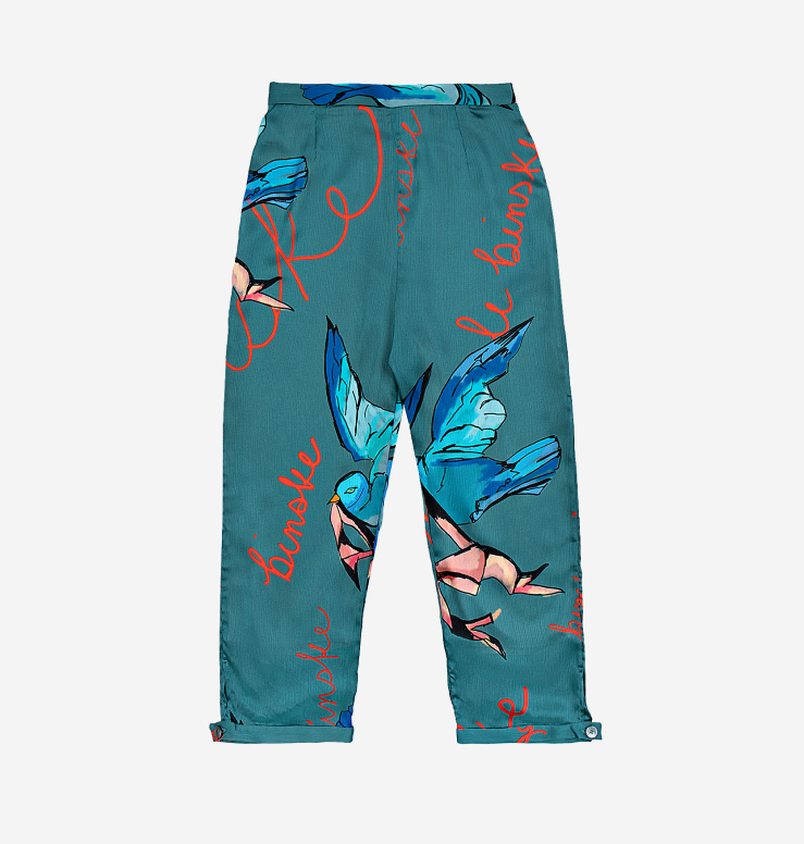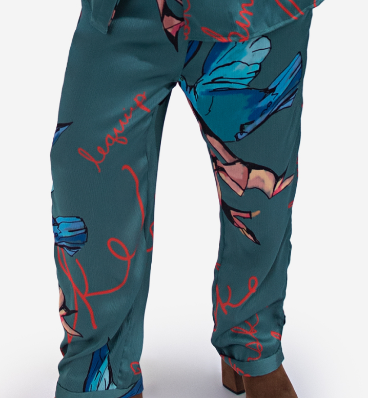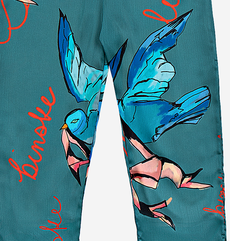 Blue bird and ‘le binske’ print capri pants | Slit opening on pant leg | Button closure on pant cuff | Pairs with Blue Bird Quincy top | 100% rayon